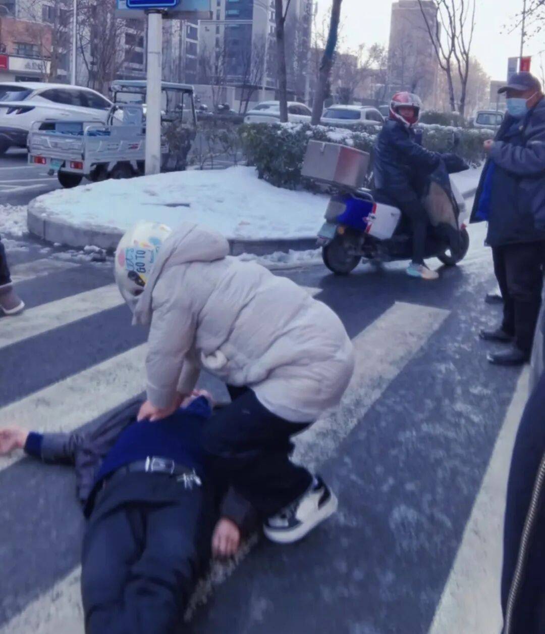 “我骑车到三全路永辉超市附近,就看到七八个人围在路边,议论声里满是慌乱。”卢薇薇事后回忆,起初以为只是普通的意外磕碰,靠近后才发现,一位老人面部朝下俯卧在冰冷的路面上,一动不动,残雪沾在老人苍白的脸颊上,透着刺骨的凉意。“作为张仲景大药房的员工,救死扶伤本就是刻在骨子里的使命,我压根没多想,当即停下车,快步冲进了人群。”